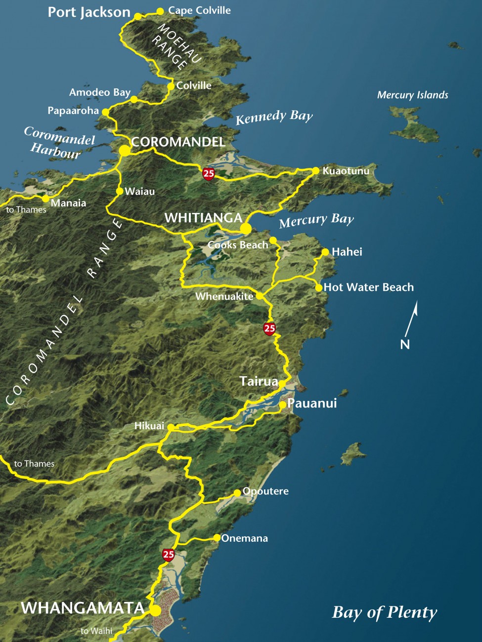 Tairua (37 km from Whitianga) is an idyllic settlement near the mouth of Tairua Harbour. Mount Paku dominates the harbour entrance, but fortunately you can drive most of the way up before climbing 178 steps and an easy rocky section to take you to a spectacular 360-degree view of land and sea. Across the harbour is the exclusive, purpose-built holiday town of Pauanui. There is a good surf beach here and a rewarding though steep climb up Pauanui Mountain from the south end of Pauanui beach. At Hikuai you can head for Thames (30 km) via SH 25a, or take the turnoff to the Broken Hills and Puketui Valley for 1/2–2-hour bush walks exploring relics of the early mining period. Take a torch as some tracks feature old (though safe) tunnels, including one that is 500 metres long. Between Hikuai and Whangamata, side roads lead to Opoutere and Onemana beaches. Opoutere has walks in dunelands and to the wildlife reserve (bird-watching), while Onemana has a lovely beach and views to the Alderman Islands.