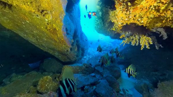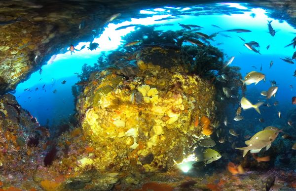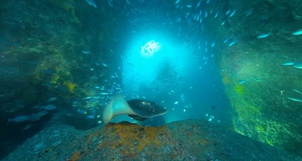Deep under Archway Island is a cavern swarming with blue maomao—a common schooling fish in New Zealand's north. They seek shelter and protection in these caves, which are wallpapered with vibrant sponges and algae.