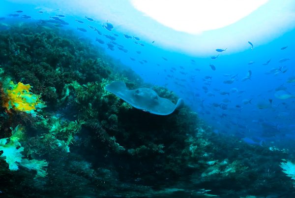 Landsbergia Rock is cloaked in a diverse forest of weeds, one of which is only found on this single rock. Swarms of maomao circle above and a short-tailed stingray gets spooked by the camera!