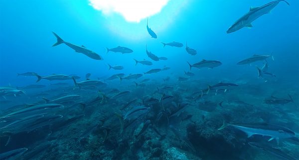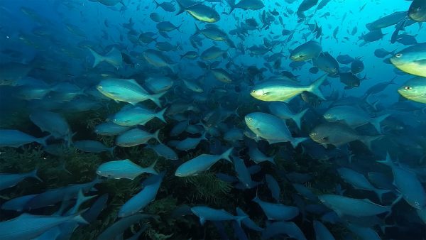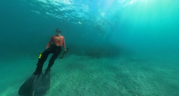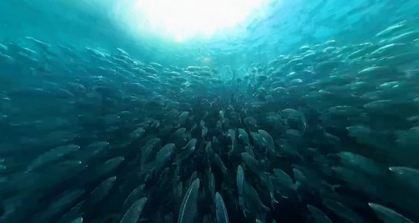 Director of photography Richie Robinson expertly pilots a dive scooter alongside a school of kingfish, thronging in the shallows at Meyer Islets.