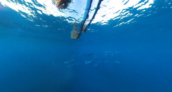 A pair of juvenile triggerfish hang beneath a hunk of driftwood encrusted with goose barnacles, some 25 kilometres out to sea.