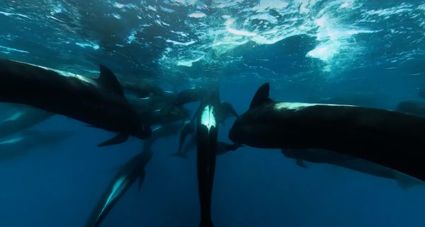 In calm water far out to sea, a group of pilot whales—including some juveniles—rests on the surface between hunts. Some doze upright in the water column, while others appear to drift off in front of the camera as they swim.