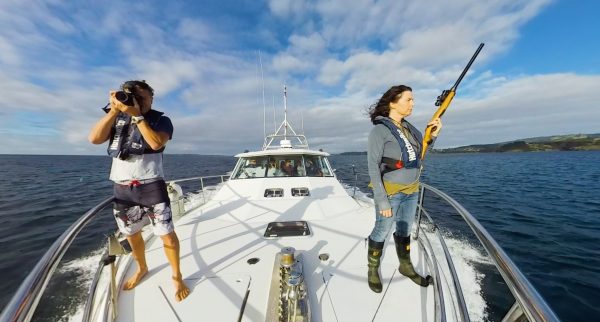 Just beyond the territorial boundary of New Zealand, marine scientist Jochen Zaeschmar takes aim at a pod of pilot whales.