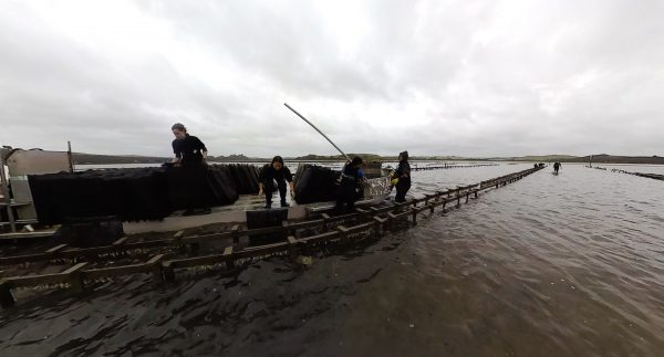 Workers repair an oyster farm damaged by a storm in the shallow upper reaches of Porotu Arm.