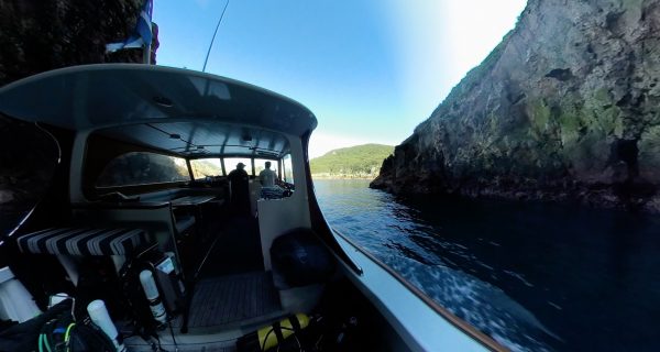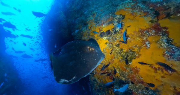 At the northern extent of the Poor Knights Islands is a gash in the rock, cutting through a promontory to a depth of more than 40 metres. Pink maomao and rays parade through it, day in day out.