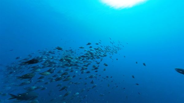 Like a flock of starlings, two-spot demoiselles and flashy koheru form dazzling murmurations at a sharp pinnacle called Laisons Reef off the coast of White Island.