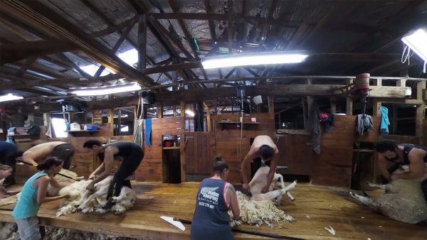 Though nearly 5pm, Harry's shearing gang digs deep to work through the last ewes on Waikura.