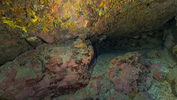 Two lionfish, trailing their elaborate manes with 18 venomous spines, linger in a cave with slender roughy and yellow-banded perch.