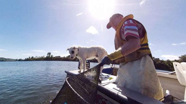 Mike Holmes pulls shortfin eels from a fyke net, under the watchful eye of his hound Jack. A decent day returns 150 kilograms—six bags—to make up his 20-tonne quota for the year.