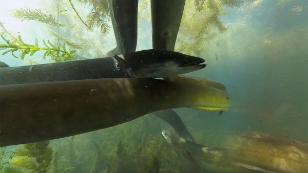 Endemic species coexist with invasives in the highly modified ecology of Lake Ohakuri on the Waikato River. Shortfin eels writhe around the camera, while introduced rudd—the 'possums of the waterways'—circle at a safe distance.