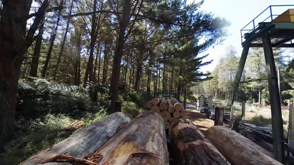 Allan Bryant guides his log truck up Waipa State Mill Road to the Whakarewarewa weighbridge to check through a load of pine from a farm wood lot near the river.
