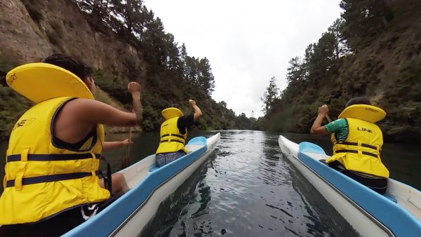 Students from Reporoa College recreate history, paddling a double-hulled waka hourua—a cultural programme run by Aotearoa Waka Experiences—through the infamous Tutukau Gorge, a section of the Waikato River two kilometres south of Orakei-Korako.