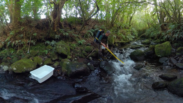 On an unnamed tributary, Fish & Game field officer Allen Stancliff and ecologist Bart Jansma survey Waiwhakaiho tributary with an electrofishing rig.