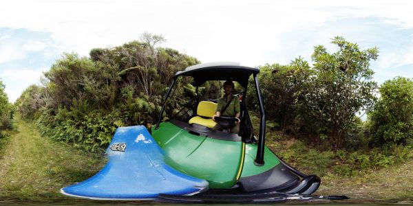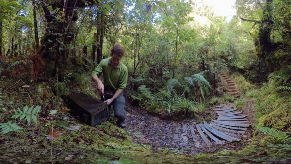 High on the top of Maud Island/Te Hoiere, DOC ranger Emmanuel Oysten checks tracking tunnels to maintain the predator free status of the island. A predator entering the baited tunnel will walk across an ink pad, leaving footprints on a white card that allows rangers to identify the intruder and know how to respond.