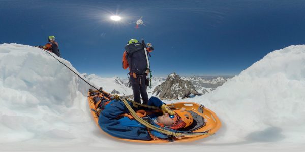 A LandSAR crew hitches a ‘banana boat’ under a rescue helicopter in a drill up on the Tasman Glacier. This LandSAR team receives about 50 call-outs a year, responding to climbers and tourists in distress, mainly during the summer season between November and April.