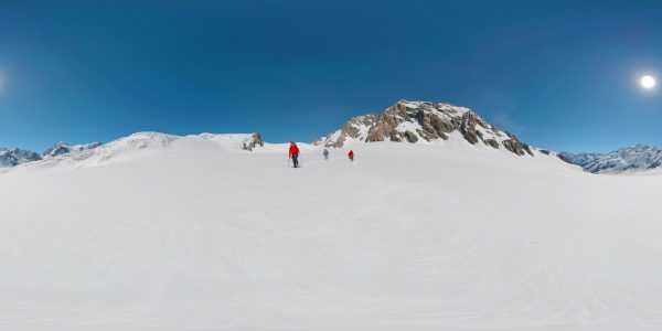 Climbers return through thick snow from shoulder of Aoraki/Mt Cook. They’re roped together, so if one falls through into a hidden crevasse in the glacier, the other has an opportunity to arrest the fall with their ice axe—the first skill that any mountain climber learns.
