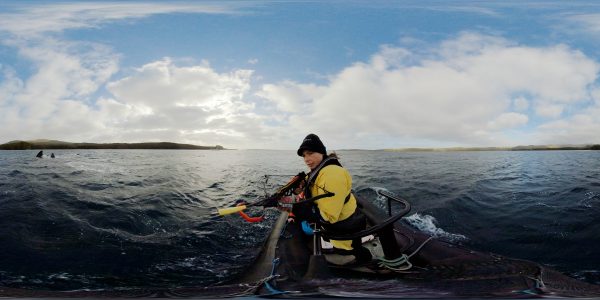 Researchers Jake Levenson, Olive Andrews and Rosie Dodd attempt to attach a LIMPET satellite tracking tag to a whale.