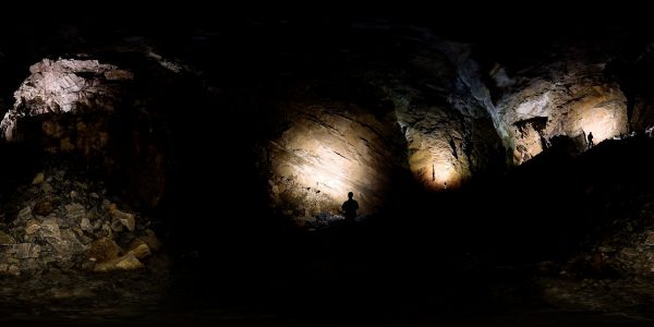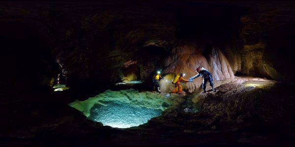 Cavers light up the interior of a massive chamber, some 60 metres across and just as high. The ground is covered in boulders the size of small cars, all of which have tumbled down the slope or fallen from the roof of the cave above, vaulted like a gothic cathedral.