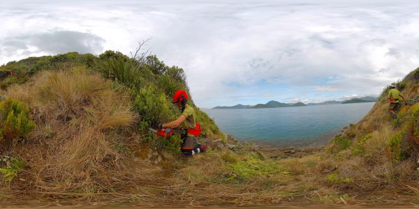 Rangers Natalie Johnson, Micaela Courtney and Chance Ngatai do some weed whacking along the steep cliffs at the northern end of the Maud Island. Here, strangely enough, pohutukawa is a weed, as seed blows across from Taranaki and takes hold anywhere there is open space. Once established it creates a monoculture canopy that prevents other species from growing.